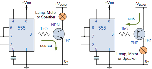This ability of the 555 timer to both “Sink” (absorb) and “Source” (supply) current means that the output device can be connected between the output terminal of the 555 timer and the supply to sink the load current or between the output terminal and ground to source the load current. For example.