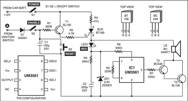 Different values of capacitor C2 give different ‘on’/‘off’ timings for relay RL1 to be ‘on’/‘off’. With 100µF we get approximately 5 seconds as ‘on’ and 5 seconds as ‘off’ time. Gate N4, with its associated components, forms a self-testing circuit. Normally, both of its inputs are in ‘high’ state. However, when one switches off the ignition key, the supply to the car audio is also disconnected. Thus the output of gate N4 jumps to a ‘high’ state and it provides a differentiated short pulse to forward bias transistor T1 for a short duration. (The combination of capacitor C1 and resistor R5 acts as the differentiating circuit.)As a result, buzzer in the collector terminal of T1 beeps for a short duration to announce that to announce that the security circuit is intact. This ‘on’ period of buzzer can be varied by changing the values of capacitor C1 and/or resistor R5. After construction, fix the LED and buzzer in dashboard as per your requirement and hide switch S1 in a suitable location. Then connect lead A to the body of car stereo (not to the body of vehicle) and lead B to its positive lead terminal. Take power supply for the circuit from the car battery directly.