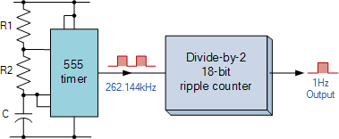 However, the data sheet also tells us that the maximum operating frequency of the 555 timer is about 300kHz and a 2% error at this high frequency, while still large at about 6kHz maximum, would be acceptable. So by choosing a higher timing frequency of say 262.144kHz and an 18-bit ripple (Modulo-18) counter we can easily make a precision 1Hz timing signal as shown below.