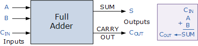 The main difference between the Full Adder and the previous Half Adder is that a full adder has three inputs. The same two single bit data inputs A and B as before plus an additional Carry-in (C-in) input to receive the carry from a previous stage as shown below.