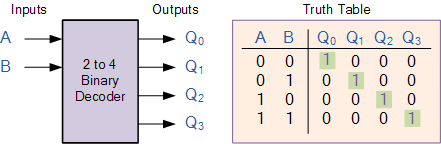 The binary inputs A and B determine which output line from Q0 to Q3 is “HIGH” at logic level “1” while the remaining outputs are held “LOW” at logic “0” so only one output can be active (HIGH) at any one time. Therefore, whichever output line is “HIGH” identifies the binary code present at the input, in other words it “de-codes” the binary input.