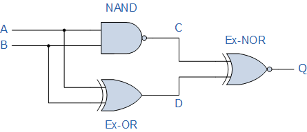 From the truth table above, column C represents the output function generated by the NAND gate, while column D represents the output function from the Ex-OR gate. Both of these two output expressions then become the input condition for the Ex-NOR gate at the output.