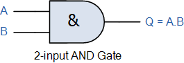 For a 2-input AND gate, the output Q is true if BOTH input A “AND” input B are both true, giving the Boolean Expression of: ( Q = A and B ).
