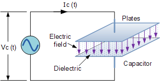 But in an AC circuit in which the applied voltage signal is continually changing from a positive to a negative polarity at a rate determined by the frequency of the supply, as in the case of a sine wave voltage. For example, the capacitor is either being charged or discharged on a continuous basis at a rate determined by the supply frequency.