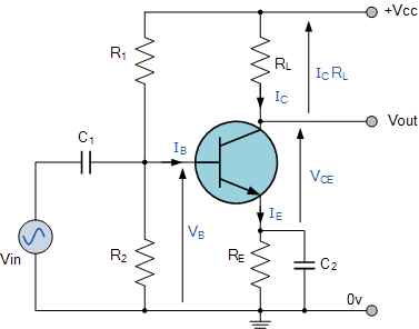 Then a single stage Common Emitter Amplifier is also an “Inverting Amplifier” as an increase in Base voltage causes a decrease in Vout and a decrease in Base voltage produces an increase in Vout. In other words, the output signal is 180o out-of-phase with the input signal.