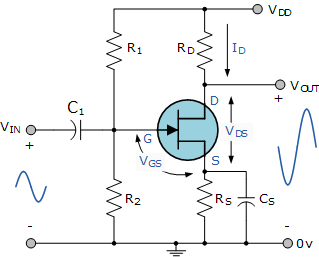 The efficiency of the common source JFET amplifier can be improved by the addition of a resistor, Rs included in the source lead with the same drain current flowing through this resistor. Resistor, Rs is also used to set the JFET amplifiers “Q-point”.