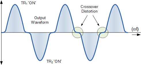 This results in one main fundamental problem with push-pull amplifiers in that the two transistors do not combine together fully at the output both halves of the waveform due to their unique zero cut-off biasing arrangement. As this problem occurs when the signal changes or “crosses-over” from one transistor to the other at the zero voltage point it produces an amount of “distortion” to the output wave shape. This results in a condition that is commonly called Crossover Distortion.