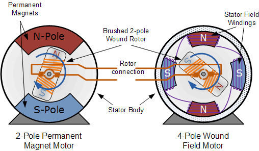 • Brushed Motor – This type of motor produces a magnetic field in a wound rotor (the part that rotates) by passing an electrical current through a commutator and carbon brush assembly, hence the term “Brushed”. The stators (the stationary part) magnetic field is produced by using either a wound stator field winding or by permanent magnets. Generally brushed DC motors are cheap, small and easily controlled.