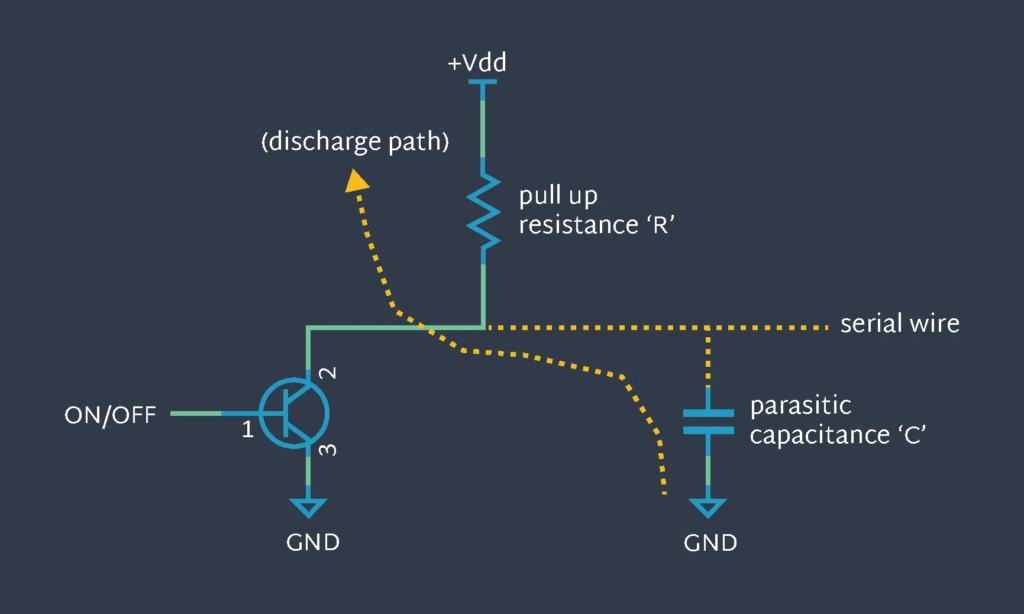 The speed of a transition between low to high on the signal bus is therefore limited by the time it takes for the electric charge stored on the parasitic capacitance on the wire ‘C’ to discharge through the pull-up resistance ‘R’, the 3dB point being defined by equation: f3dB= 1/(2π.R.C)
