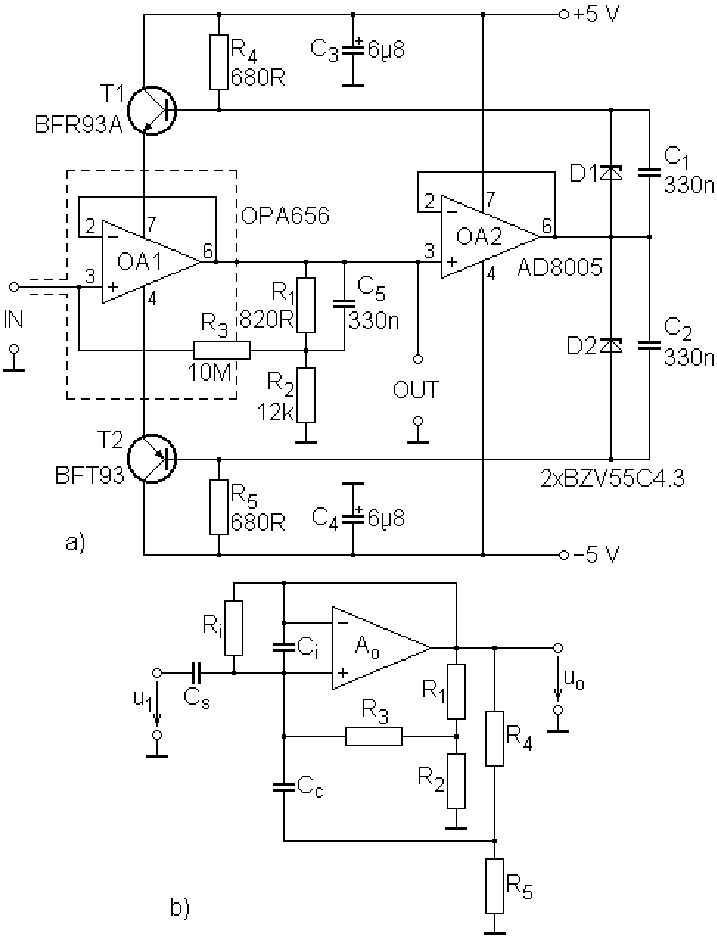 The input impedance of a.c.-coupled op amp circuits depends almost entirely on the resistance that sets the d.c. operating point. If CMOS op amps are used, the input is high, in current op amps up to 10 MΩ. If a higher value is needed, a bootstrap may be used, which enables the input impedance to be boosted artificially to a very high value. In the diagram, resistors R1 plus R2 form the resistance that sets the d.c. operating point for opamp IC1. If no other actions were taken, the input impedance would be about 20 MΩ. However, part of the input signal is fed back in phase, so that the alternating current through R1 is smaller. The input impedance, Zin, is then: Zin=(R2+R3)/R3)(R1+R2). With component values as specified, Zin has a value of about 1GΩ. The circuit draws a current of about 3 mA.