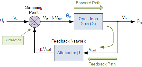 The circuit represents a system with positive gain, G and feedback, β. The summing junction at its input subtracts the feedback signal from the input signal to form the error signal Vin – βG, which drives the system.
