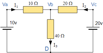 As Va = 10v and Vc = 20v , Vb can be easily found by: