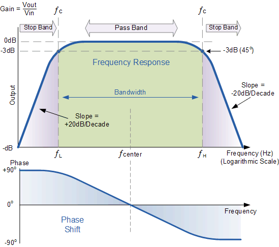 Unlike the low pass filter which only pass signals of a low frequency range or the high pass filter which pass signals of a higher frequency range, a Band Pass Filters passes signals within a certain “band” or “spread” of frequencies without distorting the input signal or introducing extra noise. This band of frequencies can be any width and is commonly known as the filters Bandwidth.