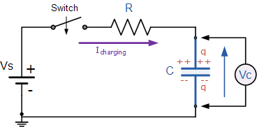 The figure below shows a capacitor, ( C ) in series with a resistor, ( R ) forming a RC Charging Circuit connected across a DC battery supply ( Vs ) via a mechanical switch. at time zero, when the switch is first closed, the capacitor gradually charges up through the resistor until the voltage across it reaches the supply voltage of the battery. The manner in which the capacitor charges up is shown below.