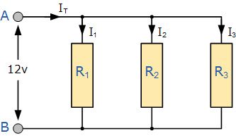 In the following resistors in parallel circuit the resistors R1, R2 and R3 are all connected together in parallel between the two points A and B as shown.