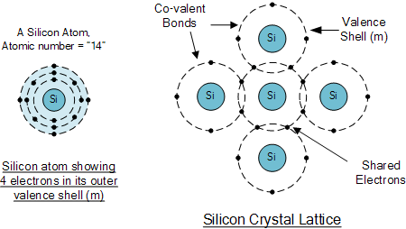 The most commonly used semiconductor basics material by far is silicon. Silicon has four valence electrons in its outermost shell which it shares with its neighbouring silicon atoms to form full orbital’s of eight electrons. The structure of the bond between the two silicon atoms is such that each atom shares one electron with its neighbour making the bond very stable.