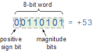 Then we can see that the Sign-and-Magnitude (SM) notation stores positive and negative values by dividing the “n” total bits into two parts: 1 bit for the sign and n–1 bits for the value which is a pure binary number. For example, the decimal number 53 can be expressed as an 8-bit signed binary number as follows.