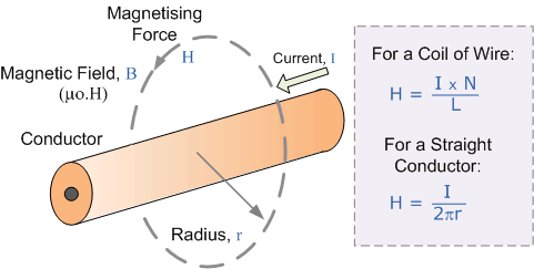 The formula therefore for calculating the “Magnetic Field Strength”, H sometimes called “Magnetising Force” of a long straight current carrying conductor is derived from the current flowing through it and the distance from it.