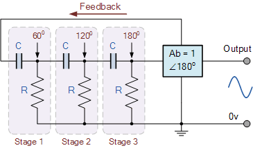We know that in an amplifier circuit either using a Bipolar Transistor or an Inverting Operational Amplifier configuration, it will produce a phase-shift of 180o between its input and output. If a three-stage RC phase-shift network is connected as a feedback network between the output and input of an amplifier circuit, then the total phase shift created to produce the required regenerative feedback is: 3 x 60o + 180o = 360o = 0o as shown.