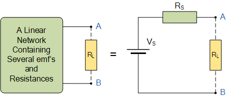 As far as the load resistor RL is concerned, any complex “one-port” network consisting of multiple resistive circuit elements and energy sources can be replaced by one single equivalent resistance Rs and one single equivalent voltage Vs. Rs is the source resistance value looking back into the circuit and Vs is the open circuit voltage at the terminals.