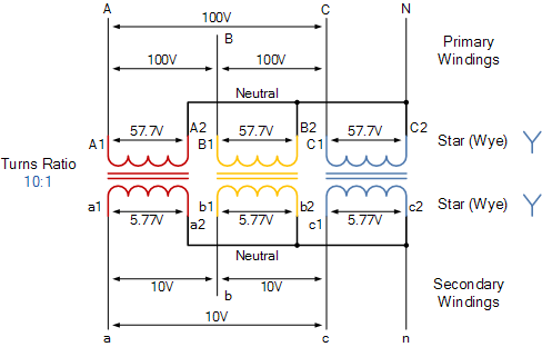 When the primary and secondary have different types of winding connections, star or delta, the overall turns ratio of the transformer becomes more complicated. If a three-phase transformer is connected as delta-delta ( Dd ) or star-star ( Yy ) then the transformer could potentially have a 1:1 turns ratio. That is the input and output voltages for the windings are the same.