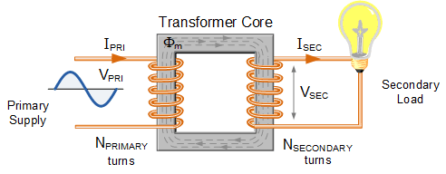 Both the primary and secondary coil windings are wrapped around a common soft iron core made of individual laminations to reduce eddy current and power losses. The primary winding of the transformer is connected to the AC power source which must be sinusoidal in nature, while the secondary winding supplies electrical power to the load. Having said that, a transformer could be used in reverse with the supply connected to the secondary winding provided the voltage and current ratings are observed.