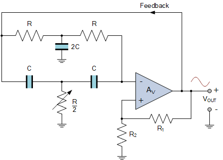 Feedback is provided by the twin-T configured RC network allowing some of the output signal to be fed back to the amplifier’s input terminal. Thus the twin-T RC network provides the 180o phase-shift and the amplifier providing another 180o of phase-shift. These two conditions create 360o in total of phase-shift allowing for sustained oscillations.